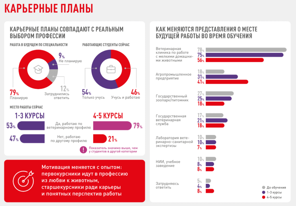 Опрос позволил проследить, как меняется взгляд студентов на профессию по мере накопления опыта и приближения к выпуску. На первых курсах абсолютное большинство учащихся хотели бы работать с мелкими домашними животными (75% респондентов), но к моменту выпуска это желание сохраняется у 56% из них. Меняется и отношение к агросектору. До старта обучения работать в нем хотели бы 18% абитуриентов, к моменту же выпуска из вуза уйти на промышленное предприятие предпочитает почти половина учащихся (41%).