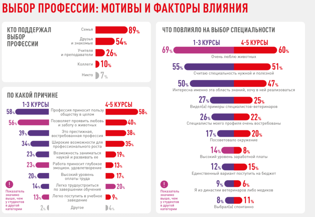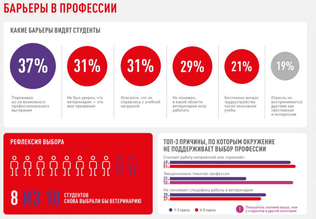 При этом каждый пятый опрошенный заявил, что сейчас изменил бы свой выбор и не пошел бы учиться на ветврача. Причина — высокий уровень стресса при лечении животных (47%) и несоответствие изначальным представлениям о профессии (37%).