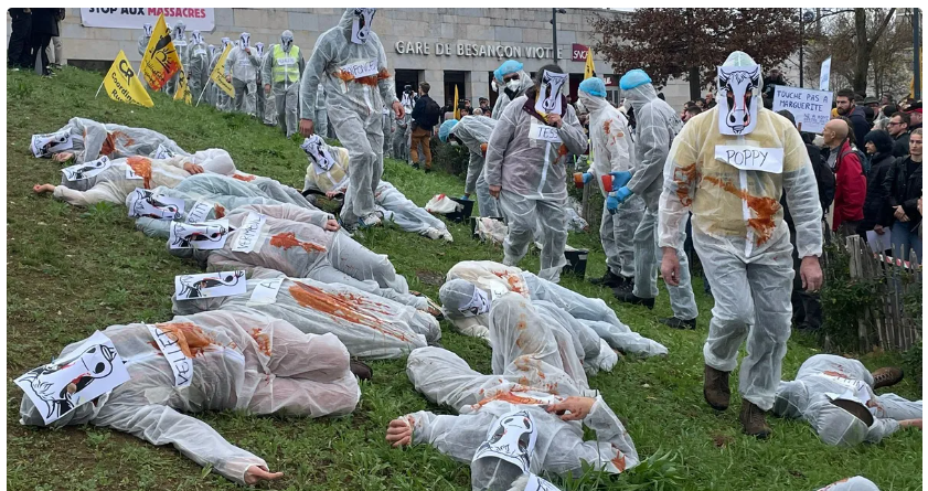До этого 83 фермера в Безансоне устроили другую акцию протеста в память об отправленном на убой 2 декабря стаде из 83 голов в регионе Пуйе-Франсе. Люди вырядились в белые халаты, надели маски коров, а также прикрепили на грудь их клички и изображали павших животных на траве.