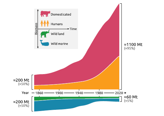 Международная группа исследователей подсчитала, что сегодня совокупная масса всех домашних млекопитающих, включая собак, кошек, крупный рогатый скот, свиней и других сельскохозяйственных животных, превышает 1 млрд тонн. Для сравнения: в середине XIX века этот показатель был почти в пять раз меньше.