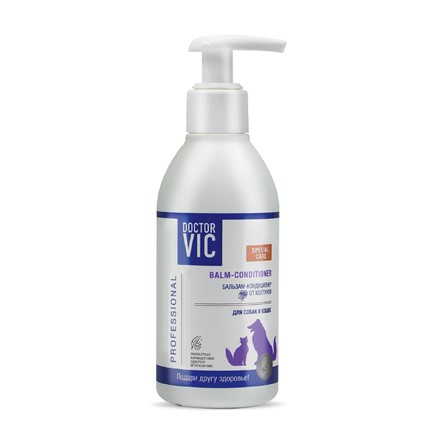 Бальзам-кондиционер для собак и кошек Doctor VIC Professional от колтунов содержит оливковое масло и экстракт меда, которые питают и восстанавливают кожно-волосяной покров. Средство наносят на колтун на 3–5 минут, после чего аккуратно прочесывают пуходеркой, двигаясь от краев к центру. При необходимости ком разделяют боковым колтунорезом.