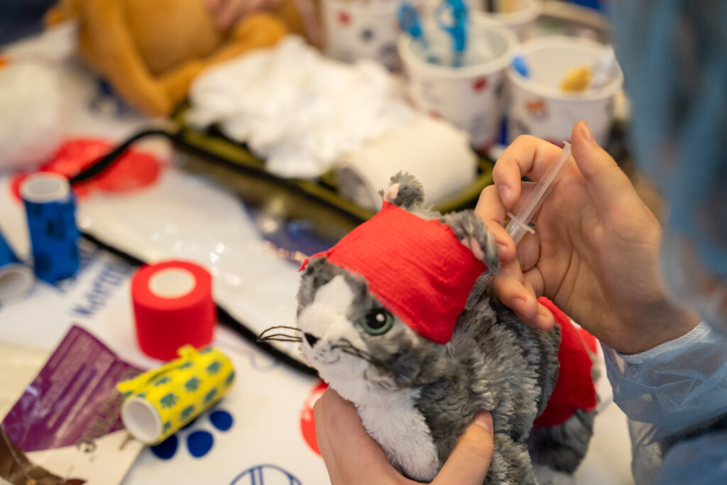 31 октября на площадке театра юные участники учились слушать сердце кошки с помощью фонендоскопа, промывать уши животным, искать клещей и блох, определять лишай лампой Вуда и даже ставить уколы на специальных макетах.