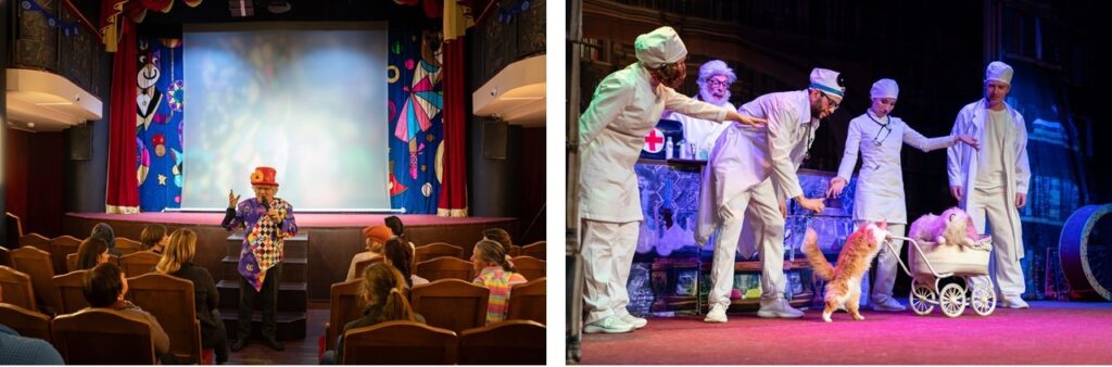 После практических занятий гостей ждал спектакль с участием знаменитых кошек Куклачева — артистов, которые, по словам создателя театра, «учат детей доброте без слов». Многие пришли целыми семьями, среди зрителей были и воспитанники благотворительного фонда «Православная семья».