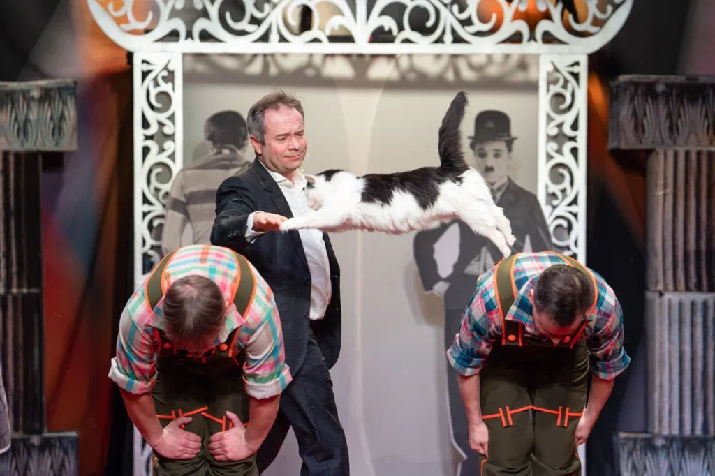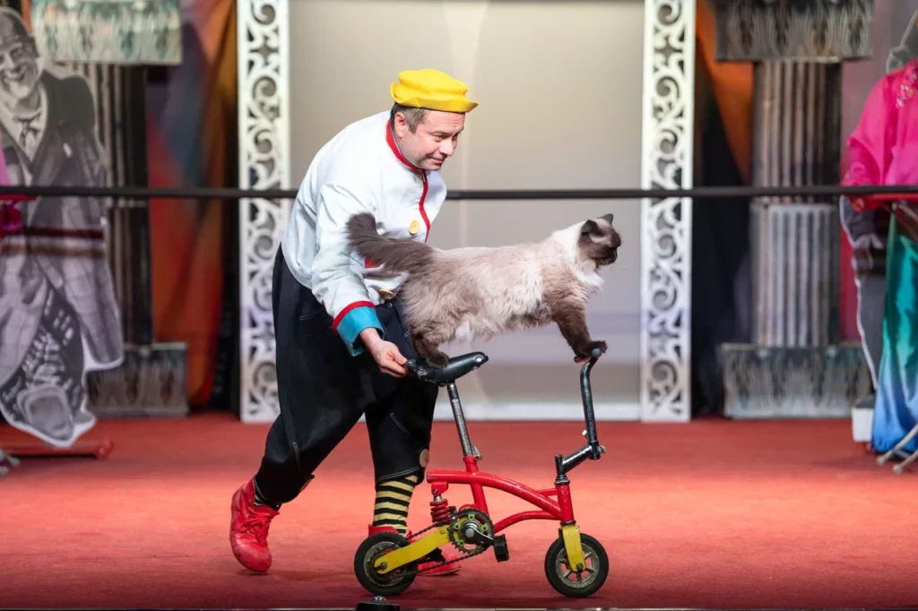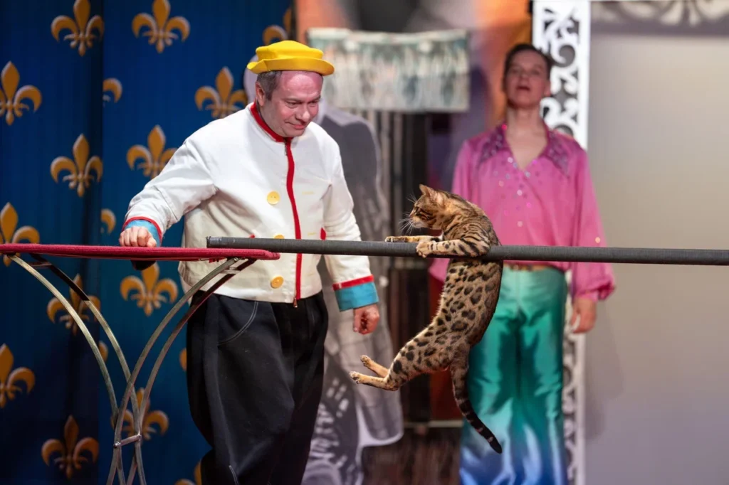 Холли, напротив, не может усидеть: быстрая и ловкая, она ловит каждое движение проводника на сцене. Она еще котенок, но уже блистательно исполняет свою роль и первые в жизни трюки.
