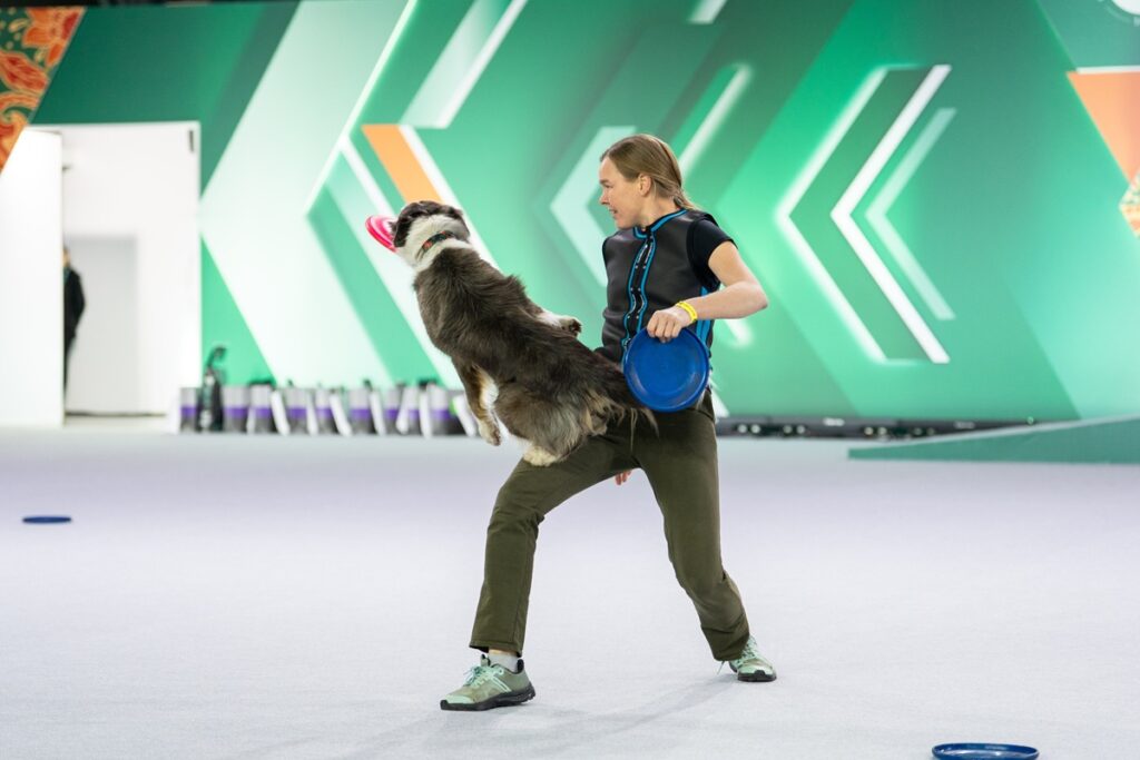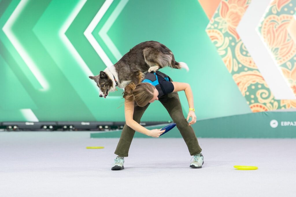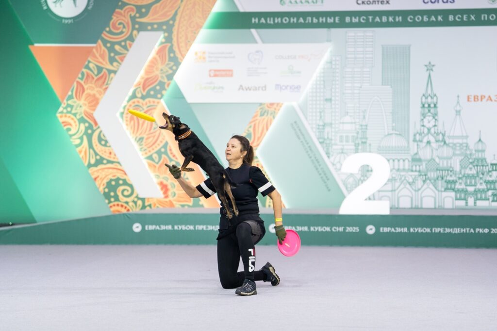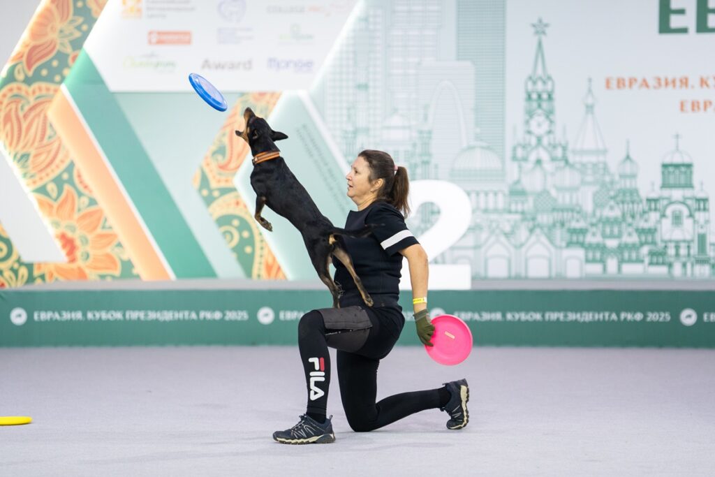 Фрисби-фристайл. Это композиция из бросков и трюков под музыку. Судьи оценивают сложность, разнообразие, взаимодействие пары, азарт и атлетизм собаки. Все элементы должны быть безопасны.