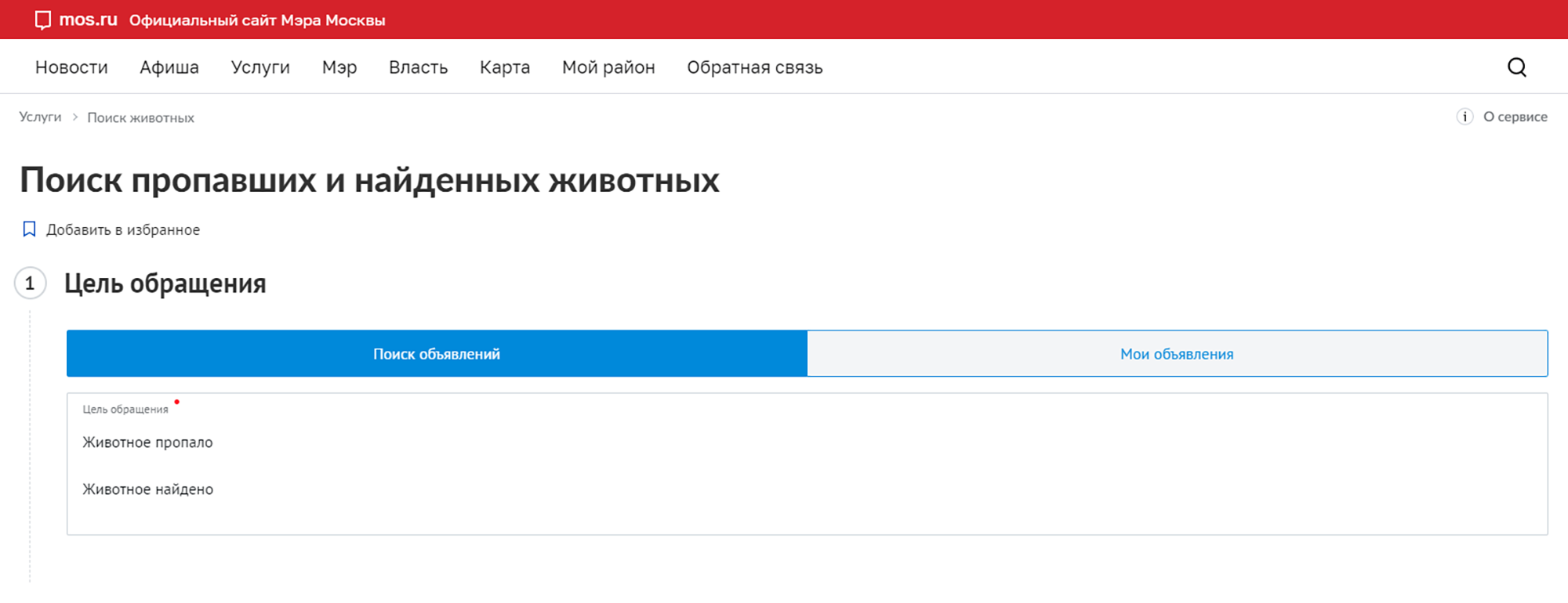 Для размещения объявления о пропавшем или найденном питомце надо на сайте mos.ru выбрать раздел «Животные и окружающий мир», далее перейти в сервис «Поиск животных». Затем требуется указать цель обращения – «Животное пропало» или «Животное найдено» – и нажать на кнопку «Найти».