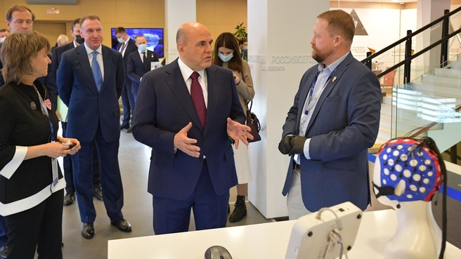 Осмотр выставки высокотехнологических товаров и услуг российских экспортёров в сфере медицины, информационных технологий и промышленности на международном экспортном форуме «Сделано в России — 2020». Фото: government.ru