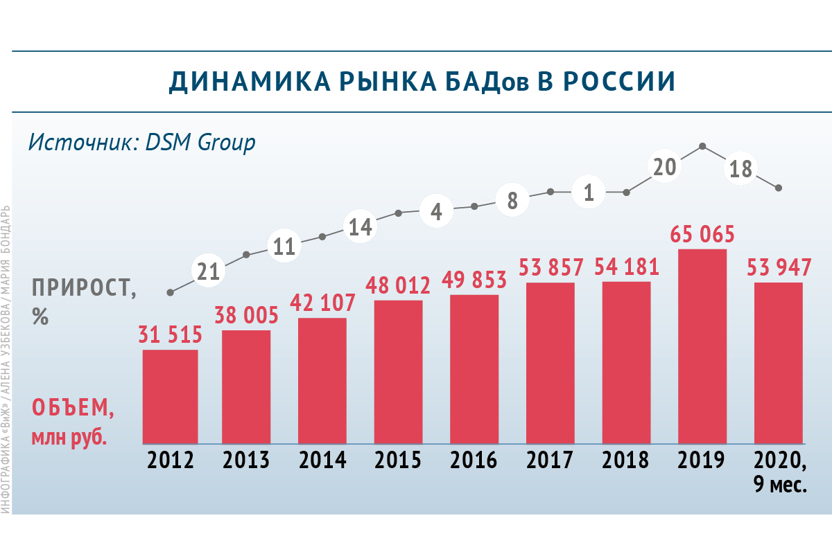 Если в 2016–2018 годах российский рынок БАДов в денежном выражении увеличивался на 1–8% в год, то в 2019 году вырос на 20%, до 65 миллиардов рублей, за девять месяцев 2020 года – на 18%, до 54 миллиардов.