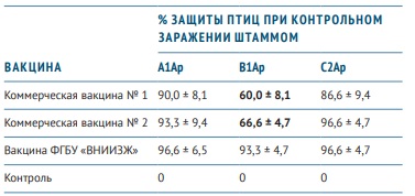 Результаты контрольного заражения при проведении сравнительных испытаний экспериментальной вакцины ФГБУ «ВНИИЗЖ», включающей антигены штаммов № 1919 (серогруппа А), № 5111 (серогруппа В), № 6261 (серогруппа С), с двумя коммерческими поливалентными вакцинами представлены в таблице (см. ниже). Результаты исследований показали, что обе коммерческие вакцины вызывают недостаточный иммунный ответ у птиц при заражении штаммом B1Ap, принадлежащим к серогруппе В.