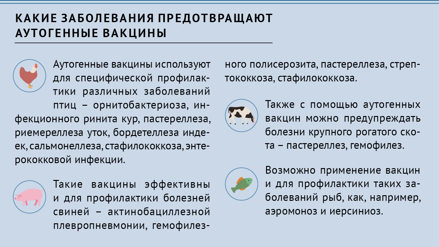 Аутогенная вакцина – это вакцина, приготовленная с использованием микроорганизмов, выделенных от заболевших животных на конкретном предприятии или в хозяйстве. Используется такая вакцина для животных этого же хозяйства, где был выделен патоген. Аутогенные вакцины помогают предотвратить специфические заболевания крупного рогатого скота, свиней, птиц, рыб. У таких вакцин несколько отличительных особенностей. «Во-первых, их использование позволяет снижать и даже прекращать применение антибактериальных препаратов, что в последние годы становится все более актуальным из-за появления резистентных микроорганизмов, – рассказал изданию «Ветеринария и жизнь» Илья Чвала, заместитель директора по НИР и мониторингу Федерального центра охраны здоровья животных (ФГБУ «ВНИИЗЖ» Россельхознадзора). – Во-вторых, аутогенные вакцины эффективны в профилактике заболеваний, вызванных одним или несколькими возбудителями, за счет формирования высокоспецифического напряженного иммунитета против патогенов конкретного хозяйства».