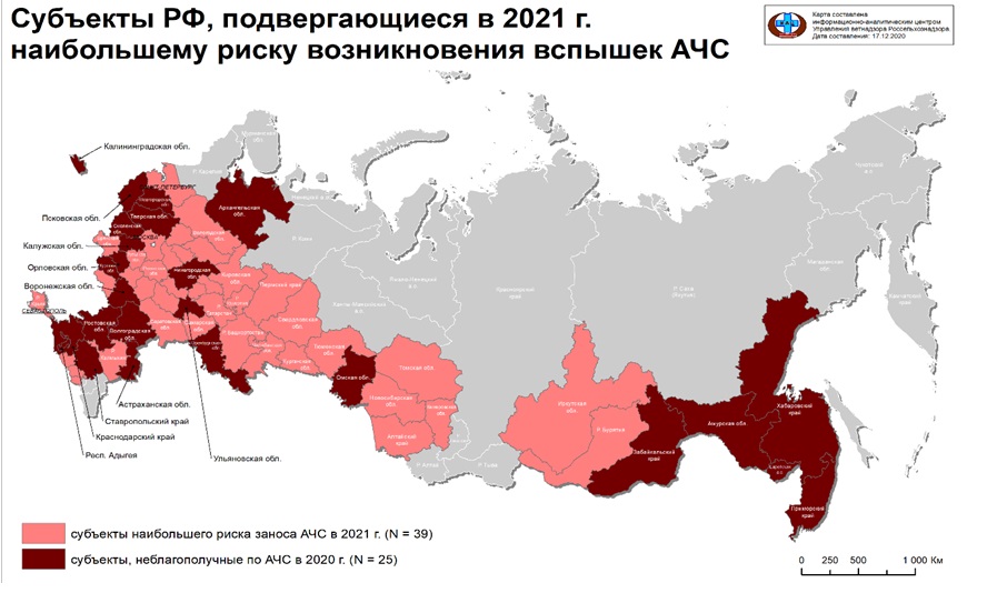 «Особенно велик риск для Кемеровской области, Алтайского края, Сахалинской, Новосибирской, Омской, Тюменской, Свердловской, Курганской и Челябинской областей, Республик Татарстан, Удмуртия, Чувашия, Мордовия и Марий Эл, которые демонстрируют достаточно высокий уровень плотности свинопоголовья, способствующий распространению заболевания в восприимчивой популяции», – рассказал «ВиЖ» кандидат ветеринарных наук Антон Караулов, руководитель Информационно-аналитического центра управления ветнадзора ФГБУ «ВНИИЗЖ».