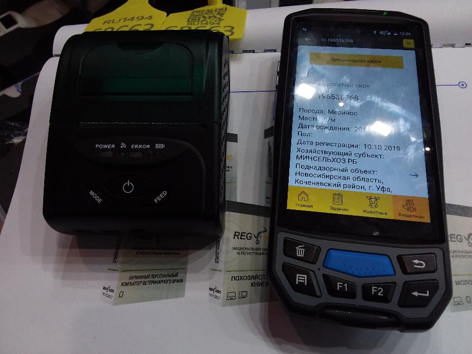 КПК размером со смартфон, к нему прилагается мини-принтер для оперативной распечатки документов. Ветврач с помощью этого гаджета может также провести регистрацию животного на территории хозяйства даже в режиме офлайн. После маркировки животного, например, ушной биркой сама метка сканируется с помощью карманного компьютера, на котором установлена мобильная версия программы для регистрации животных «РегАгро». Далее считанный код заносится в систему.